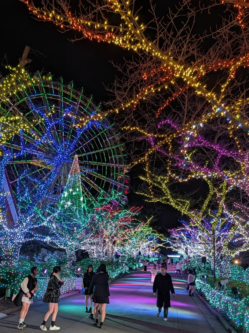 17時くらいに入園して、まだ明るいからそんなにきれいじゃないねーなんて言いながらビール飲んでたら、だんだん暗くなってきて徐々に鮮やかに浮かび上がってくるイルミネーションの灯りが綺麗でした。