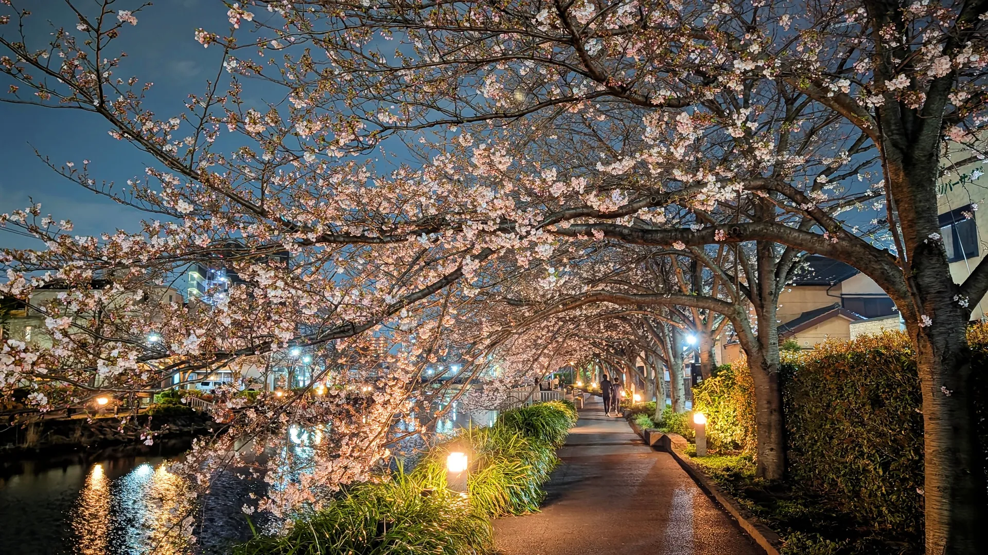 この桜並木を夜に見に来るのが毎年恒例になっています。